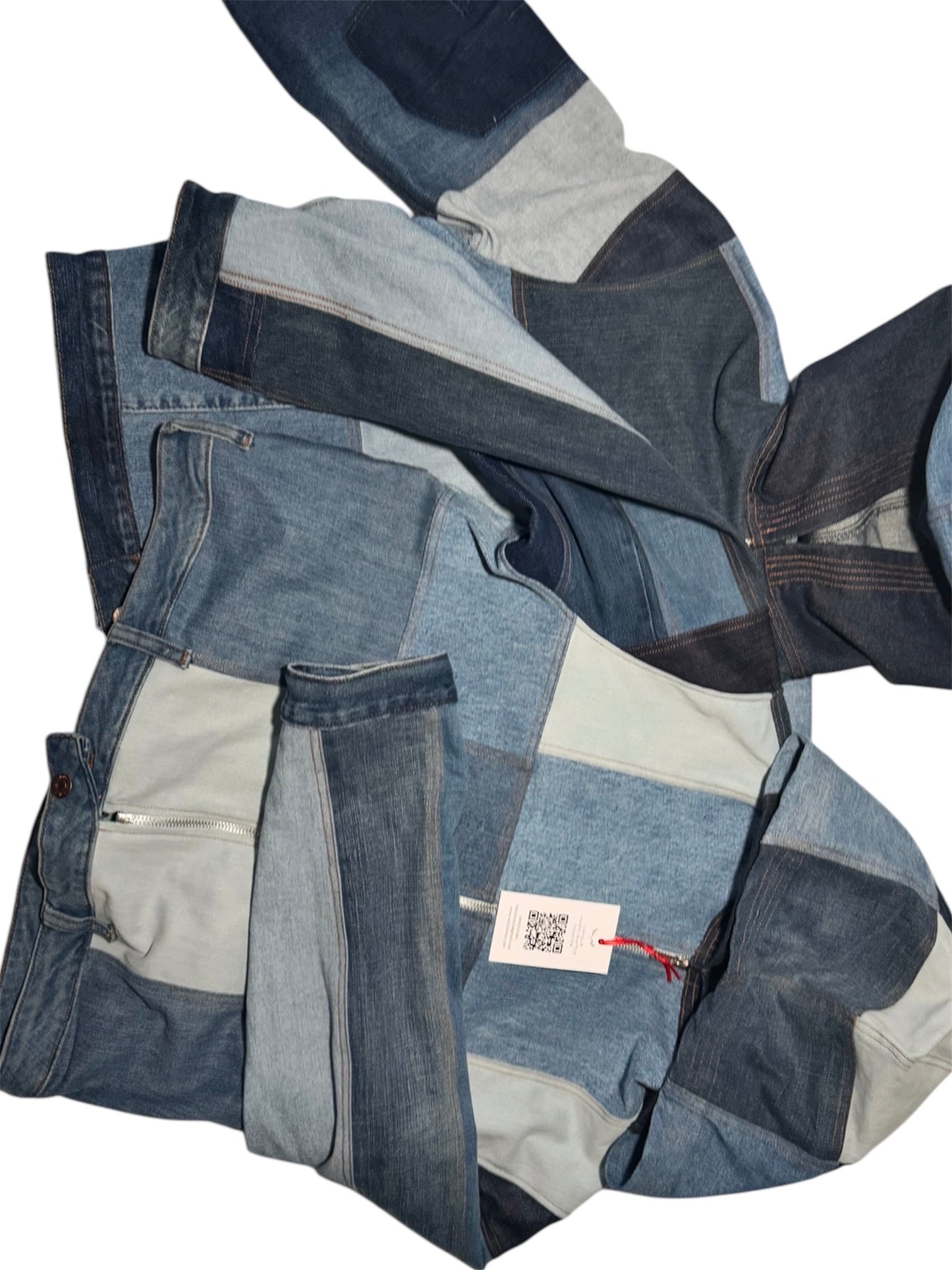 Handcrafted THE DENIM jacket made from different denim pieces. Unisex jacket. One size jacket.