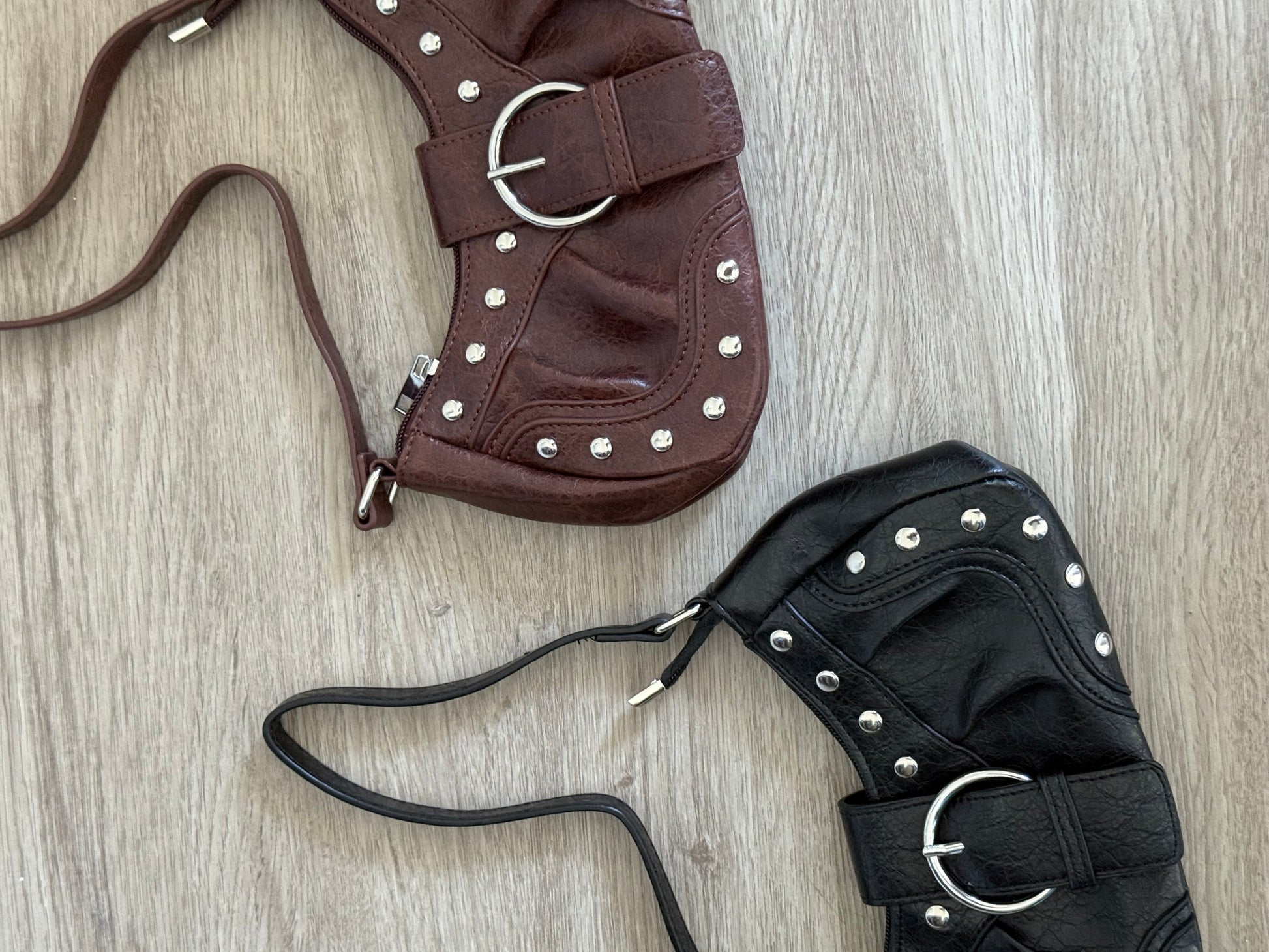Meet your new go-to night bag — bold, compact, and unapologetically cool. Designed with silver studs and curved leather panels, it gives every outfit that effortless off-duty edge. Fits your essentials perfectly (phone, keys, lip gloss — the real priorities).