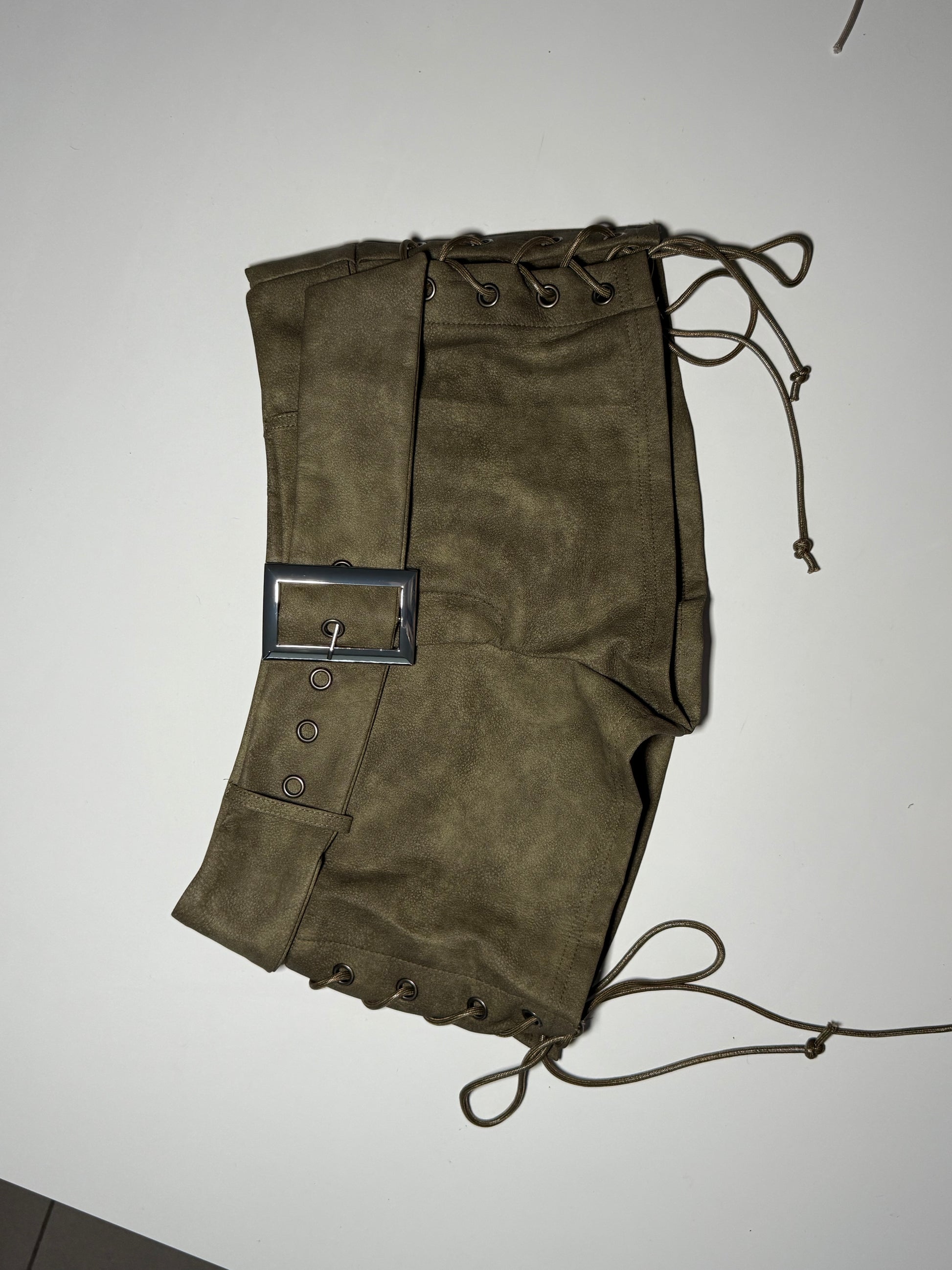 Vegan leather low rise shorts with lace up sides and bold silver buckle. Adjustable on the waist.