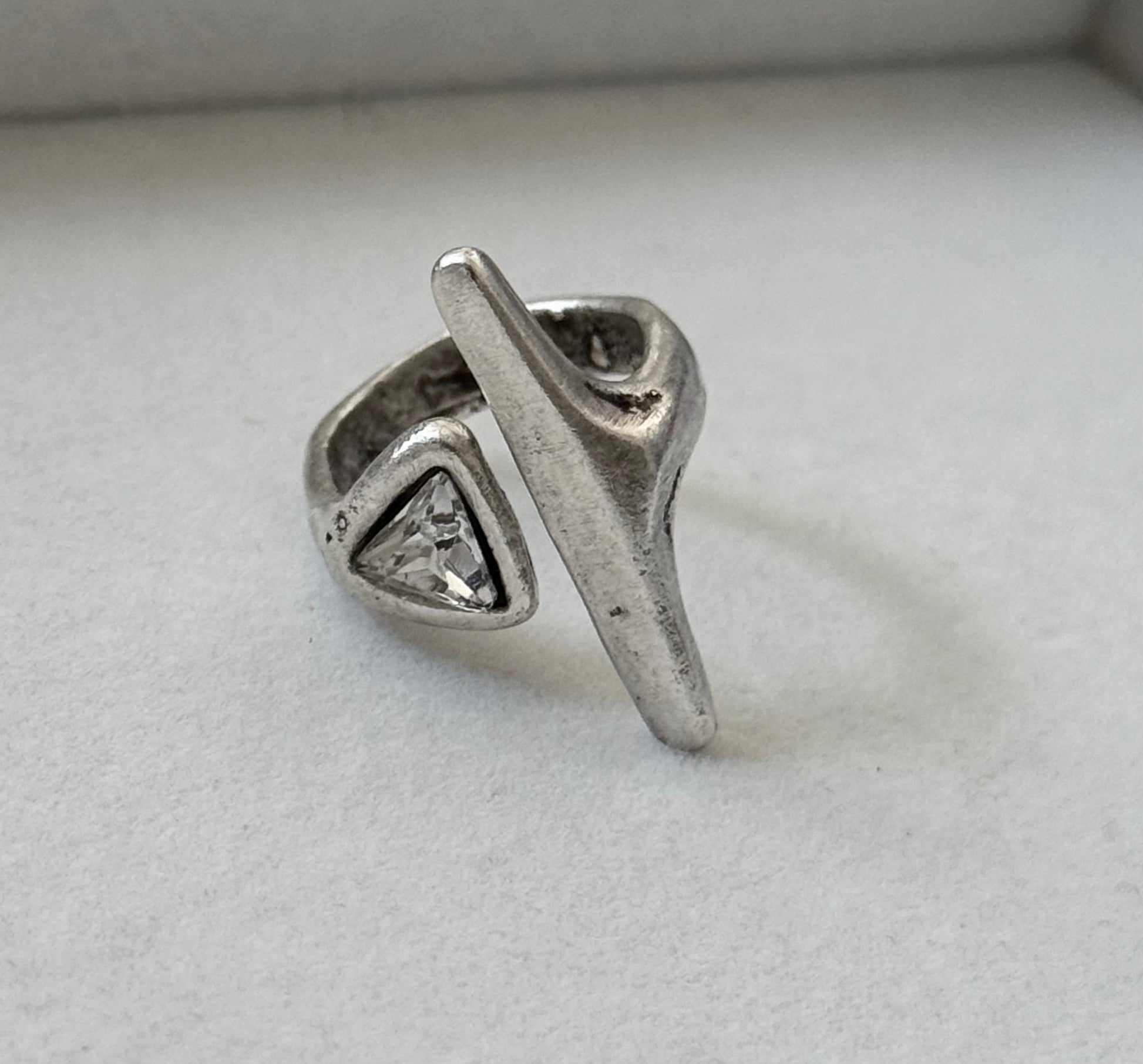 A geometric silver ring featuring a triangle-set crystal, combining clean lines with a touch of sparkle. The Lyra Ring redefines minimalism with a bold and elegant edge.