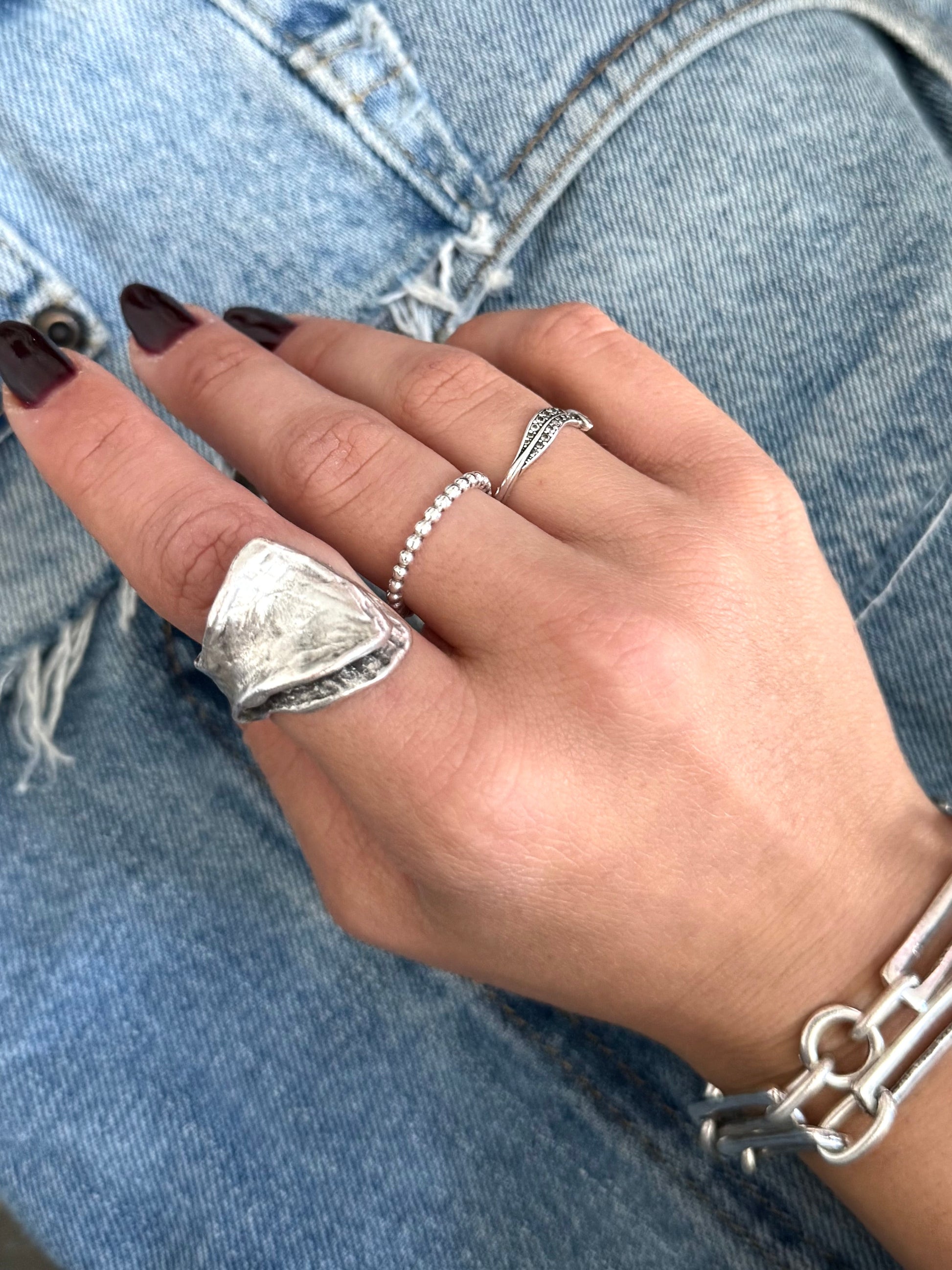 An organic, sculptural ring inspired by natural textures and fluid forms. The Myra Ring is a statement piece designed to express individuality and timeless style. Adjustable style ring.