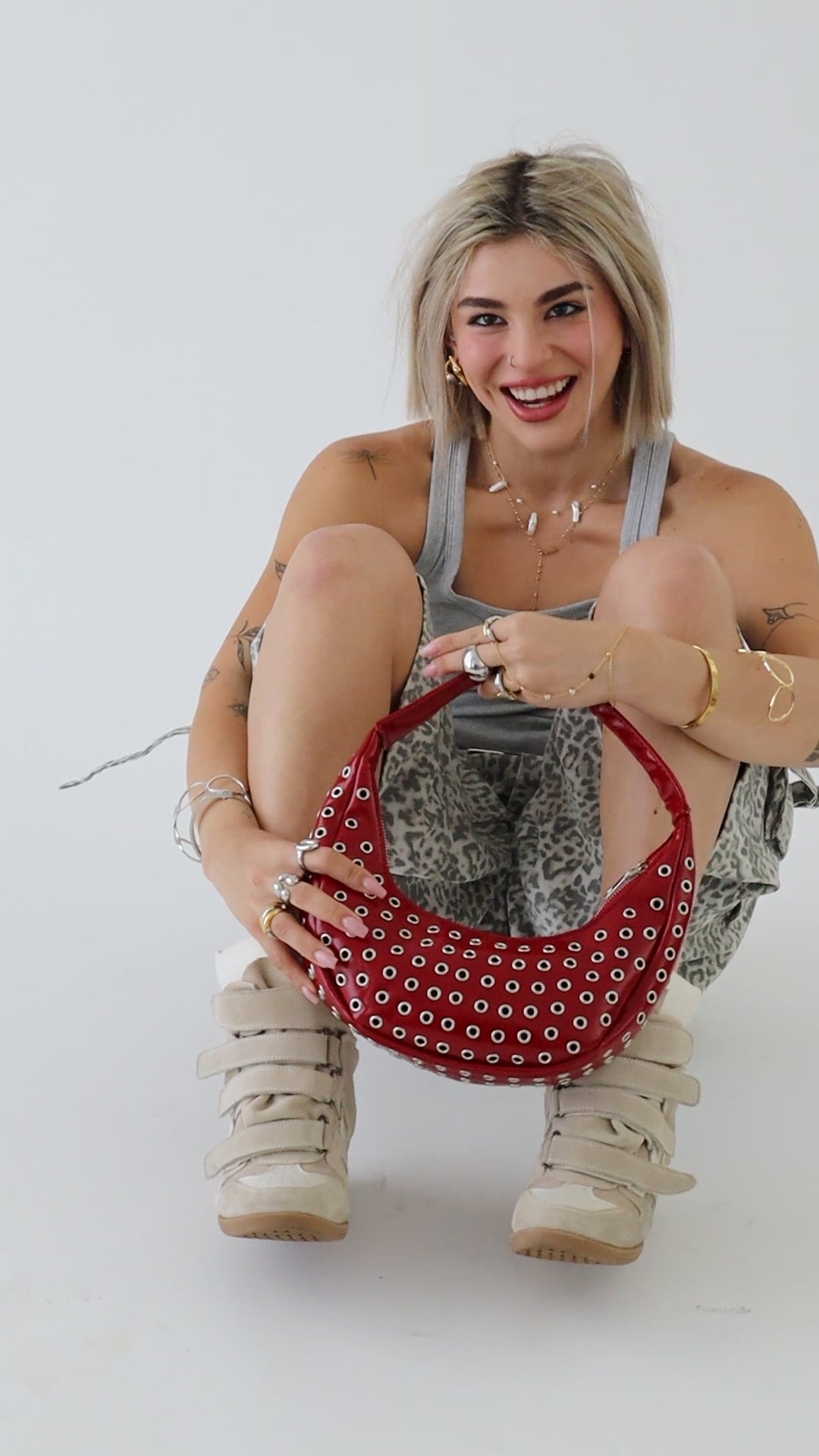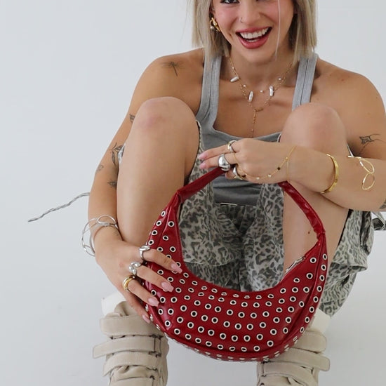 Mini studded bag with silver open studs. Definitely the statement piece you were missing!