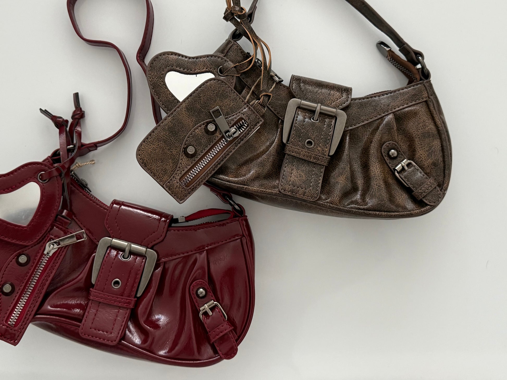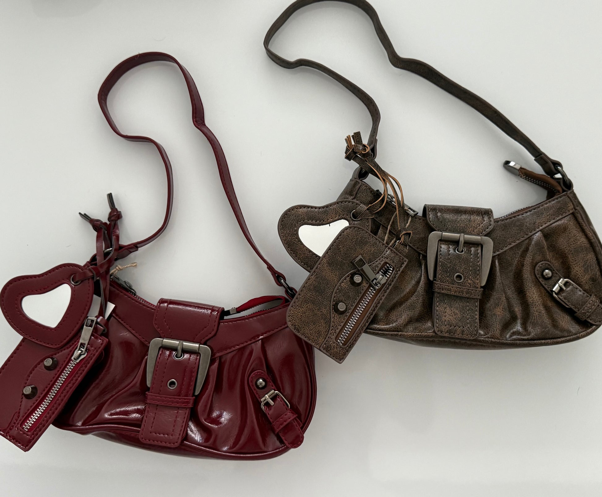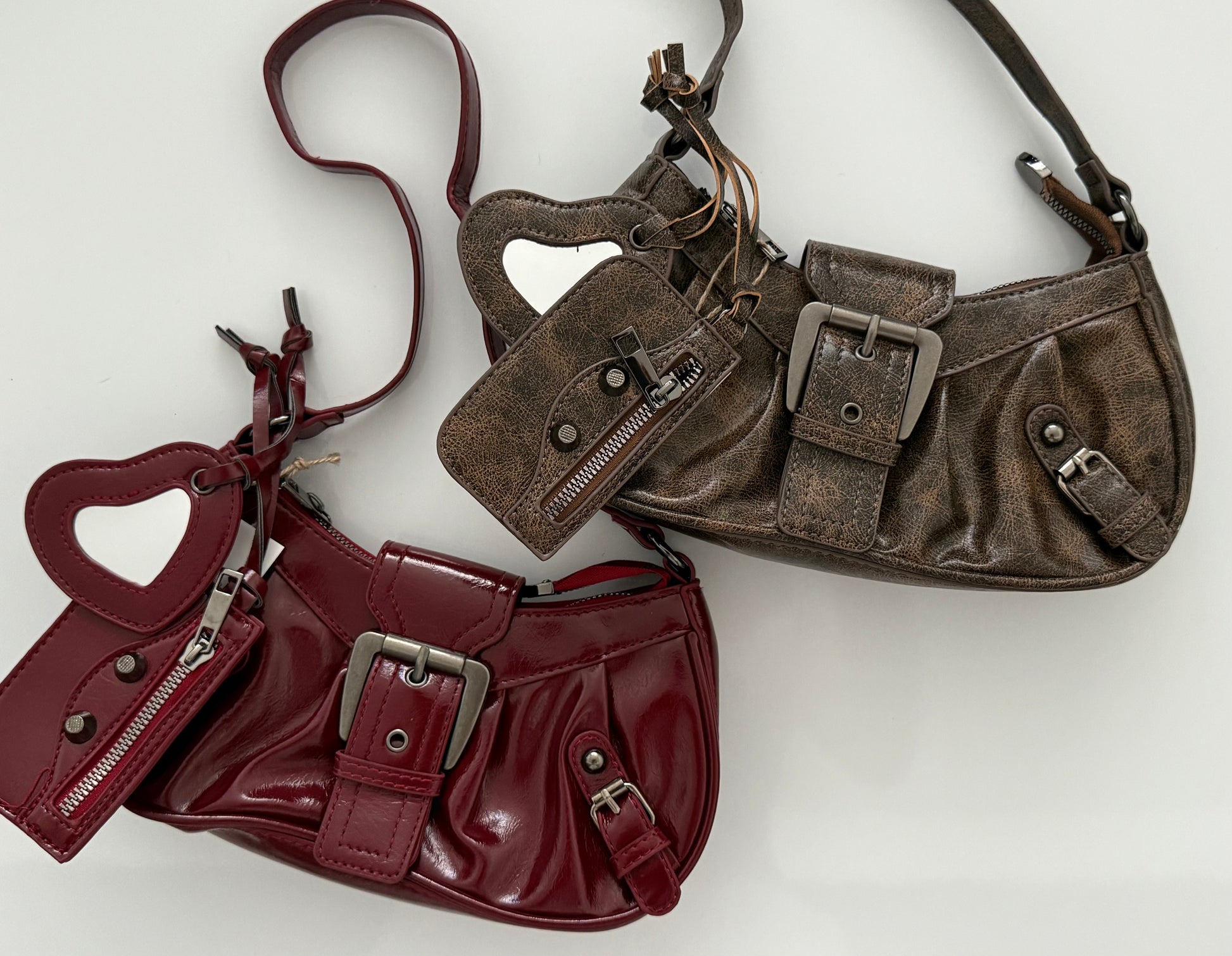 Meet your new statement bag — edgy, versatile, and made to stand out. Each piece comes with a detachable heart-shaped mirror keychain (because checking your look on the go is non-negotiable) and a mini wallet charm that clips right onto your bag. Wear it, layer it, accessorize it — this bag was designed to keep up with you.